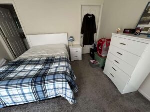 This bedroom set features a bed, nightstand, and chest of drawers. They are in very good condition. Box spring and mattress can be included