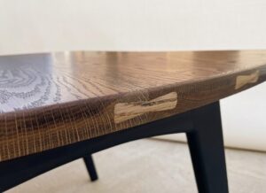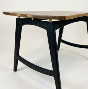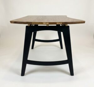 I designed and built this one-off white oak and fir writing desk. The base is dyed select douglas fir featuring tapered legs and gently curved stretchers. The base is constructed using pinned half-lap and mortise and tenon joinery. Eight polished brass standoffs connect the base to the top. The top is solid white oak with dyed black grain accents and gently curved edges to match the base. The front edge has a larger roundover to provide a soft edge on the working side of the desk. Bowtie inlays dot the edges of the desktop, providing an interesting and fun design element. The base and top are finished with a hand-rubbed hard wax oil for a durable, close-to-the-wood finish.