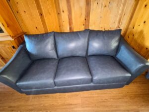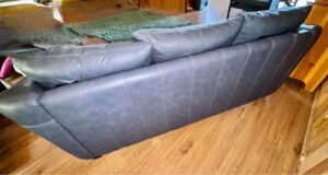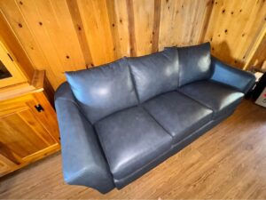 Omnia 100% Leather Spencer 3 Seat Sofa in Denver Lux Blue. 7'L x 3'W. Couch is like new. Proof of purchase and warranty included.